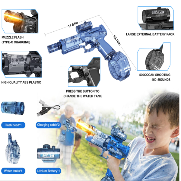Légy te a nyári csaták bajnoka ezzel a nagy teljesítményű motoros vízipisztollyal, amely nemcsak lenyűgöző hatótávolságával, hanem interaktív LED-es fényhatásaival is garantálja az élményt – nappal vagy akár sötétedés után is! Legyen szó hátsó kertben zajló víziháborúról, medenceparti játékokról vagy tengerparti összecsapásokról, ez a vízipisztoly minden környezetben megállja a helyét.